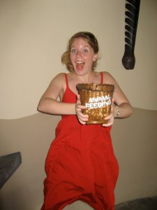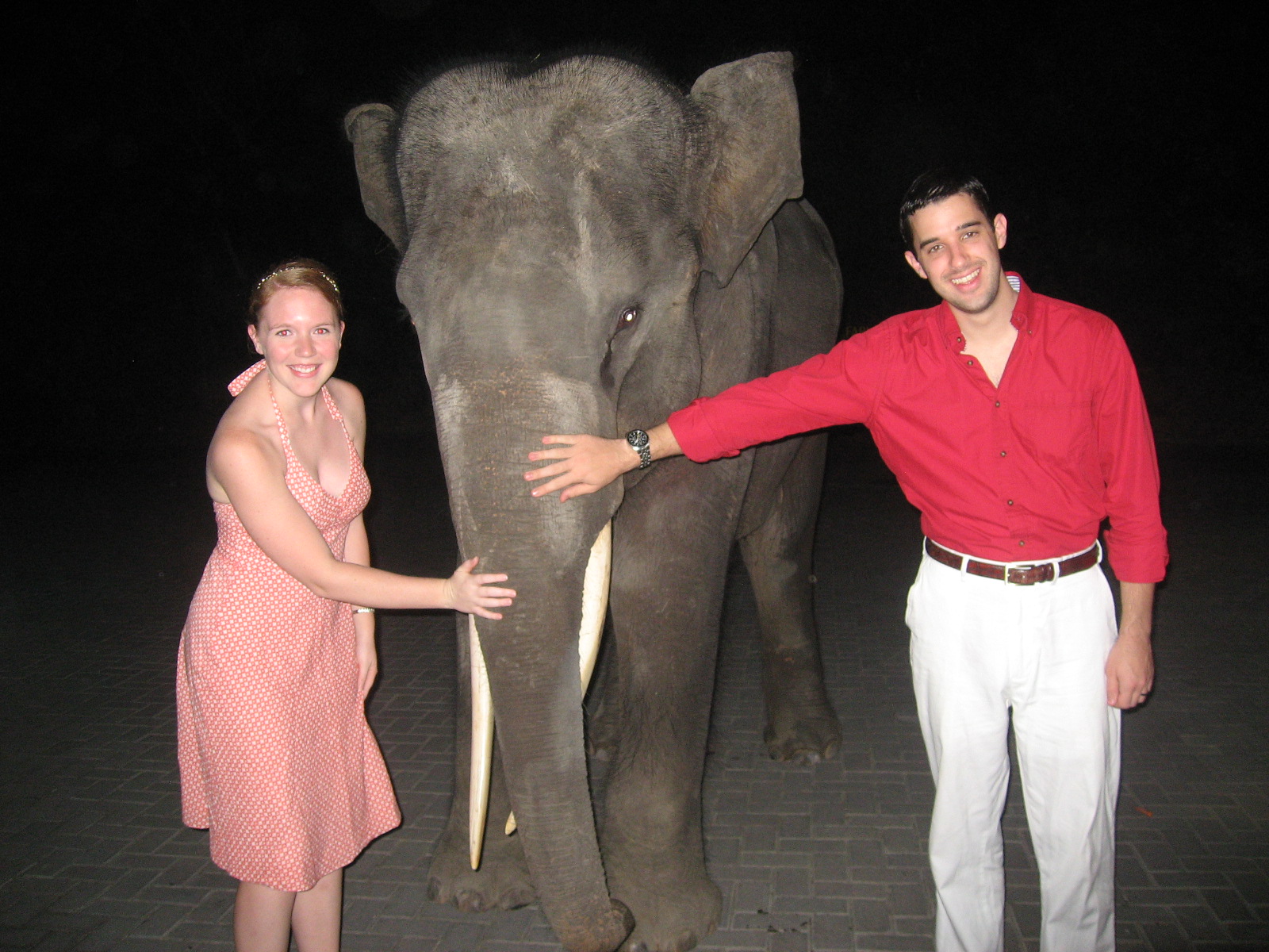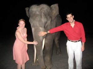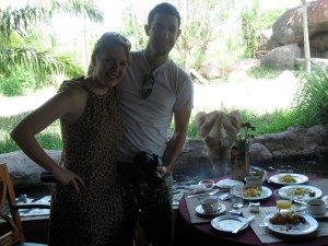 After a day at the Safari in the hot sun, we went back to our savanna bungalow to take a little break. As we were getting ready for dinner, we received a phone call. “Mr. Candeto, there is a baby elephant in the lobby.” That is a sentence I never thought I would hear. We hurriedly got ready and headed to the hotel lobby where we encountered the “baby elephant”–all 18 years and several tons of him. After feeding him a banana and a quick photo op, we headed into the restaurant for another dinner with the lions.