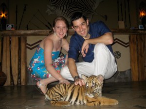 Our room overlooked a “savanna” and was filled with zebras, elephants, wildebeests, and even a rhino named Nelson. We even had an “animal feeding” bucket in the room that was full of carrots so we could feed the animals from our balcony. So cool! The pool overlooked the same savanna. It was and interesting experience to be floating in a pool in Bali and to see a zebra stroll by. After cleaning up, we received a phone call from our friend Uru telling us he was off work for the evening and he would see us in the morning. That night we had our Thanksgiving dinner at the Lion Restaurant (thanks, Grandmother and Papaw!!!), a dining spot situated next to a lion enclosure. Before we entered the restaurant, we had a chance to play with a baby liger–a lion and tiger mix.