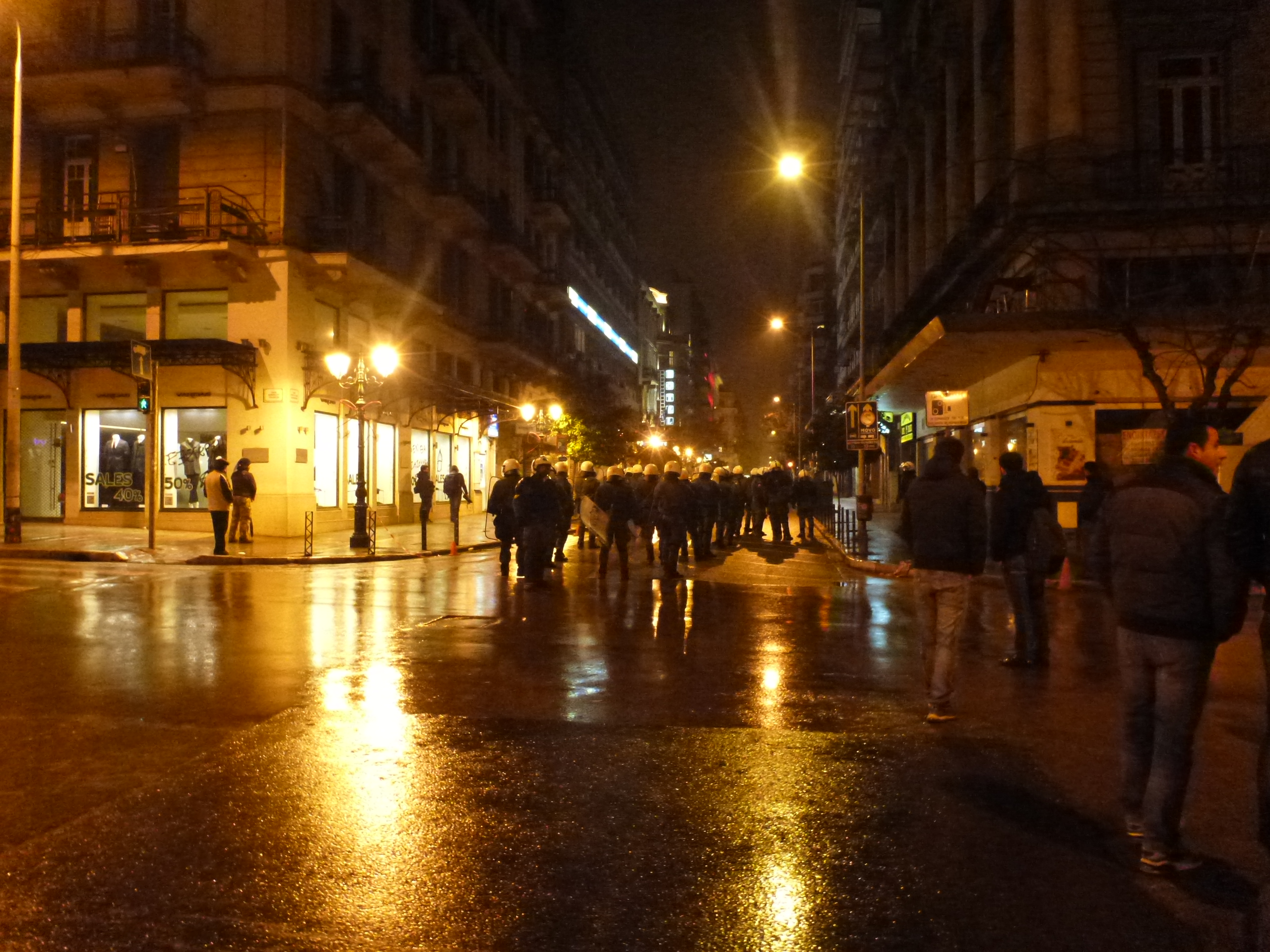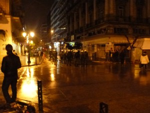 As the march proceeded to a small square, things got a little ugly. People began shooting fireworks into buildings, setting dumpsters on fire, and throwing things are the riot police. By this point, we were a couple of blocks from the demonstration, but we could see it as it was slightly uphill. There were about 15 riot police officers between us and what was going on. We were amongst several observers, mostly Greek, all watching this chaos with a look of dismay and some of disgust. Eventually, as things escalated, the police shot tear gas into the crowd to get things to calm down. As you can imagine, this agitated the protesters and they continued to throw things at the police.
